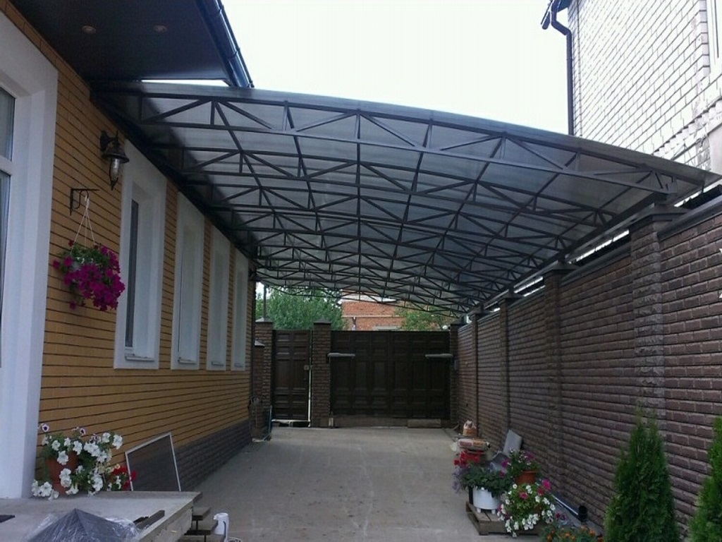 Поэтому компания "Навес Строй" настоятельно рекомендует не экономить, а усилить каркас навеса из поликарбоната более жёсткими профилями с увеличенной толщиной металла и количеством несущих ферм.